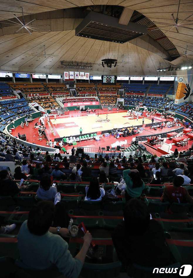 (서울=뉴스1) 박정호 기자 = 코로나19 방역지침 조정으로 프로야구 경기 관중 입장이 재개된 후 첫 주말인 24일 오후 서울 잠실학생체육관에서 열린 '2021-2022 KGC인삼공사 정관장 프로농구' 서울 SK와 원주 DB의 경기를 관중들이 관전하고 있다.