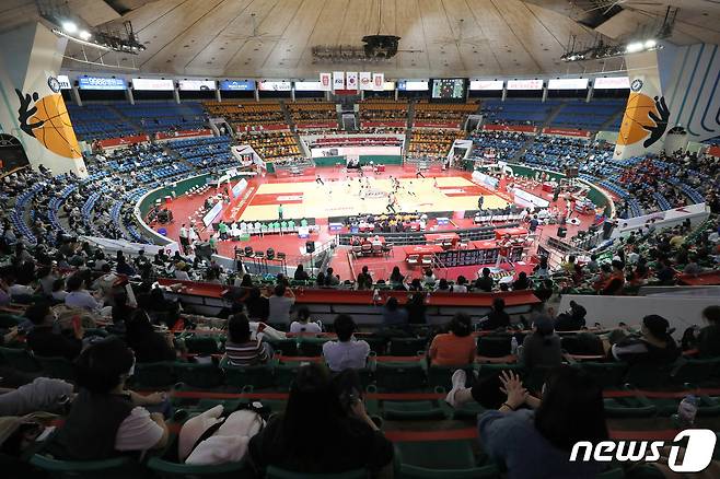 (서울=뉴스1) 박정호 기자 = 코로나19 방역지침 조정으로 프로야구 경기 관중 입장이 재개된 후 첫 주말인 24일 오후 서울 잠실학생체육관에서 열린 '2021-2022 KGC인삼공사 정관장 프로농구' 서울 SK와 원주 DB의 경기를 관중들이 관전하고 있다.