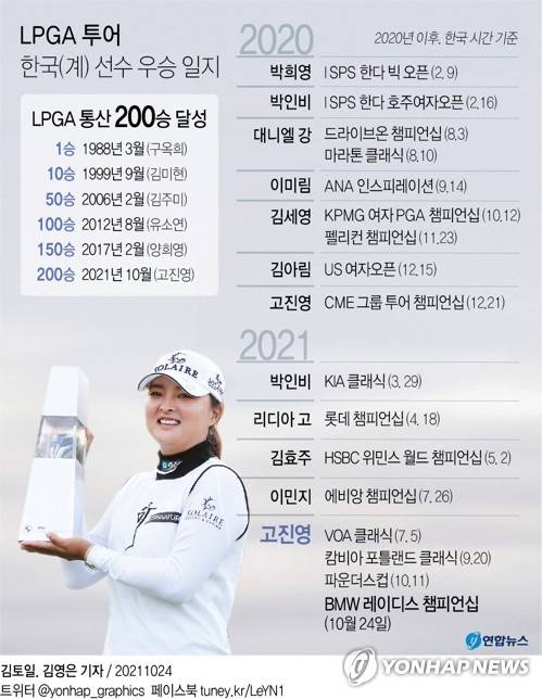 (서울=연합뉴스) 김영은 기자 = 24일 부산에서 끝난 미국여자프로골프(LPGA) 투어 BMW 레이디스 챔피언십(총상금 200만 달러)에서 고진영(26)이 우승하며 한국 선수들의 LPGA 투어 통산 200승째가 달성됐다.