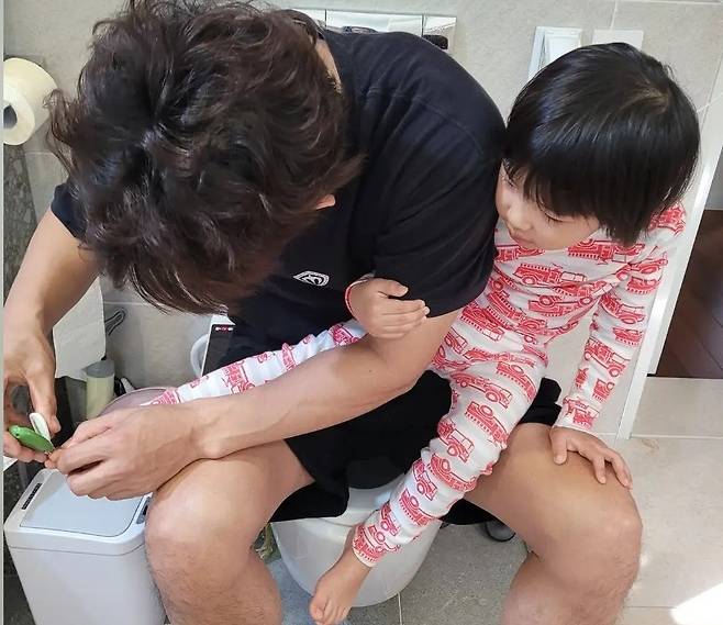 공개된 사진 속 오지호는 화장실 변기 위에 앉아 아들의 발톱을 깎아주고 있다.