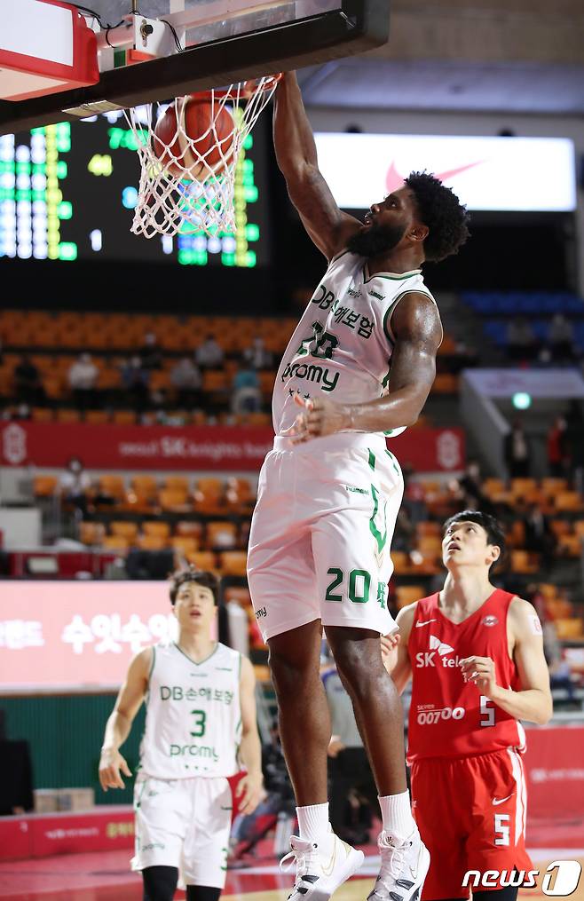 (서울=뉴스1) 박정호 기자 = 24일 오후 서울 잠실학생체육관에서 열린 '2021-2022 KGC인삼공사 정관장 프로농구' 서울 SK와 원주 DB의 경기에서 DB 프리먼이 원핸드 덩크슛을 꽂아 넣고 있다. 2021.10.24/뉴스1