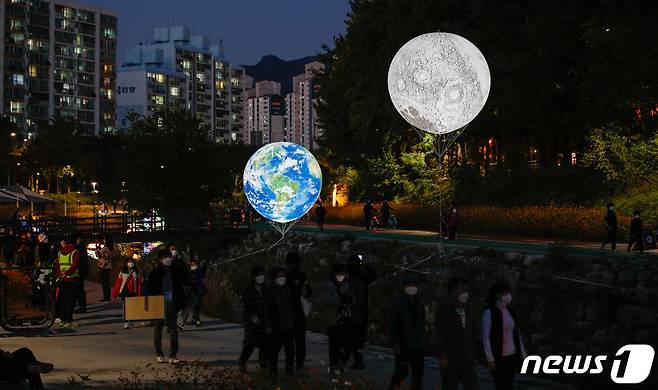 (서울=뉴스1) 안은나 기자 = 24일 오후 서울 노원구 당현천에서 시민들이 2021 노원달빛산책 행사차 마련된 다양한 작품을 보며 걷고 있다. 2021.10.24/뉴스1