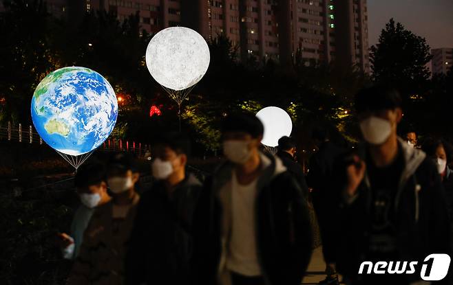 (서울=뉴스1) 안은나 기자 = 24일 오후 서울 노원구 당현천에서 시민들이 2021 노원달빛산책 행사차 마련된 다양한 작품을 보며 걷고 있다. 2021.10.24/뉴스1