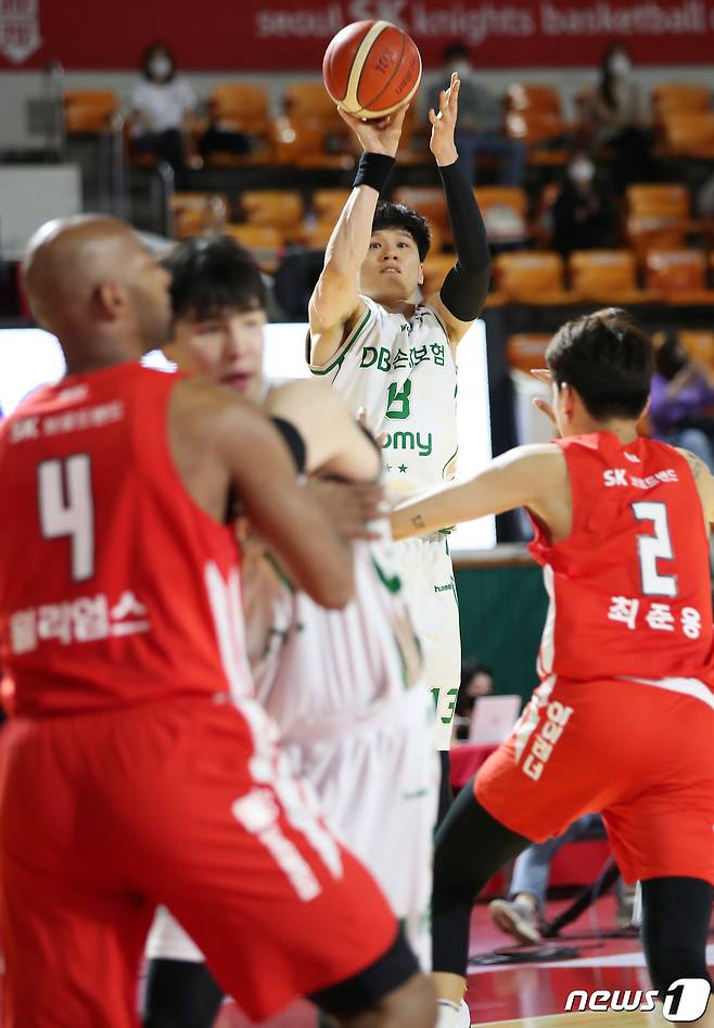 (서울=뉴스1) 박정호 기자 = 24일 오후 서울 잠실학생체육관에서 열린 '2021-2022 KGC인삼공사 정관장 프로농구' 서울 SK와 원주 DB의 경기에서 DB 윤호영이 슛을 던지고 있다. 2021.10.24/뉴스1
