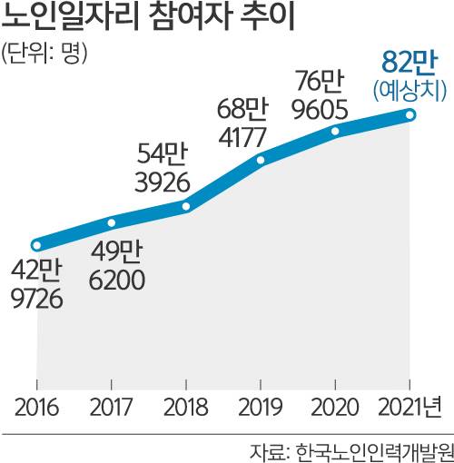 실제 노인일자리는 여러 방면에서 효과가 확인되고 있다. 한국노인인력개발원 ‘노일일자리 및 사회활동 지원사업 실태조사’ 등에 따르면 노인일자리 참여자들의 상대적 빈곤율(75.4%)은 미참여자와 비교해 7.3%포인트 감소했다. 월평균 소득(126만원)은 참여 후 17만원 늘었다. 건강이 좋아졌다(74%), 가치 있는 일로 사회에 보탬이 된다(85.6%)는 긍정적 변화도 있었다.
