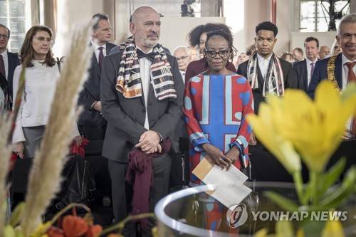 epa09542813 The 2021 Peace Prize laureate, Zimbabwean author and filmmaker Tsitsi Dangarembga (C-R) and her husband Olaf Koschke (C-L) attend the ceremony of the Peace Prize of the German Book Trade at the Paulskirche church in Frankfurt am Main, Germany, 24 October 2021. The Peace Prize of the German Book Trade by the German Publishers and Booksellers Association (Boersenverein des Deutschen Buchhandels) worth 25,000 EUR is presented since 1950 at the end of the Frankfurt Book Fair. EPA/Thomas Lohnes / Evangelischer Pressedienst / POOL