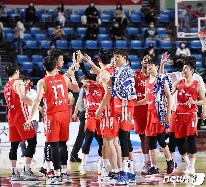 (서울=뉴스1) 박정호 기자 = 24일 오후 서울 잠실학생체육관에서 열린 '2021-2022 KGC인삼공사 정관장 프로농구' 서울 SK와 원주 DB의 경기에서 대승을 거둔 SK 선수들이 자축하고 있다. 2021.10.24/뉴스1