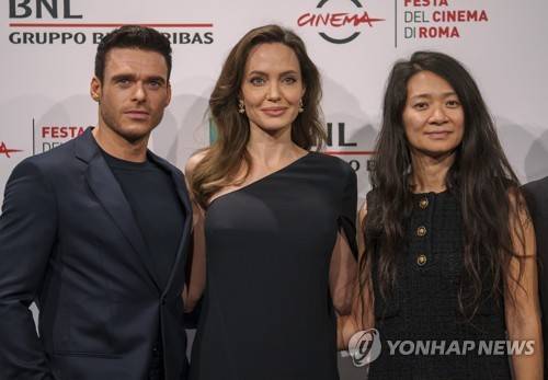From left, Richard Madden, Angelina Jolie, and director Chloé Zhao pose during a photo call for the movie 'Eternals' at the 16th edition of the Rome Film Fest in Rome, Sunday, Oct. 24, 2021. (AP Photo/Domenico Stinellis)