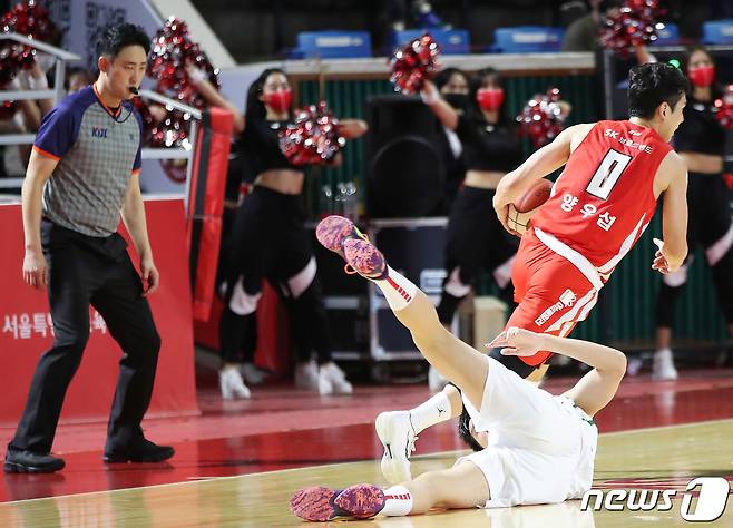 (서울=뉴스1) 박정호 기자 = 24일 오후 서울 잠실학생체육관에서 열린 '2021-2022 KGC인삼공사 정관장 프로농구' 서울 SK와 원주 DB의 경기에서 SK 양우섭을 막던 DB 타이치가 중심을 잃고 넘어지고 있다. 2021.10.24/뉴스1