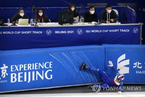 Tommaso Dotti of Italy falls while competing during the final of the men's 5000m relay at the ISU World Cup Short Track speed skating competition, a test event for the 2022 Winter Olympics, at the Capital Indoor Stadium in Beijing, Sunday, Oct. 24, 2021. (AP Photo/Mark Schiefelbein)