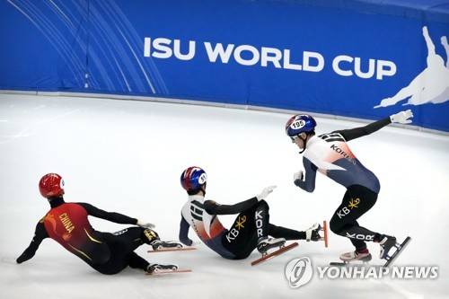 Wu Dajing of China, left, and Kim Dong-wook of South Korea fall while competing during the final of the men's 5000m relay at the ISU World Cup Short Track speed skating competition, a test event for the 2022 Winter Olympics, at the Capital Indoor Stadium in Beijing, Sunday, Oct. 24, 2021. (AP Photo/Mark Schiefelbein)
