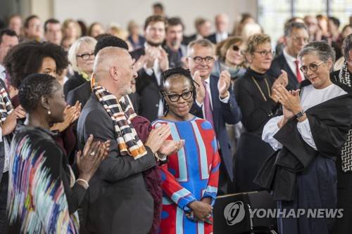 epa09542887 The 2021 Peace Prize laureate, Zimbabwean author and filmmaker Tsitsi Dangarembga (C) is applauded during the Peace Prize of the German Book Trade ceremony at the Paulskirche church in Frankfurt am Main, Germany, 24 October 2021. The Peace Prize of the German Book Trade by the German Publishers and Booksellers Association (Boersenverein des Deutschen Buchhandels) worth 25,000 EUR is presented since 1950 at the end of the Frankfurt Book Fair. EPA/Thomas Lohnes / Evangelischer Pressedienst / POOL