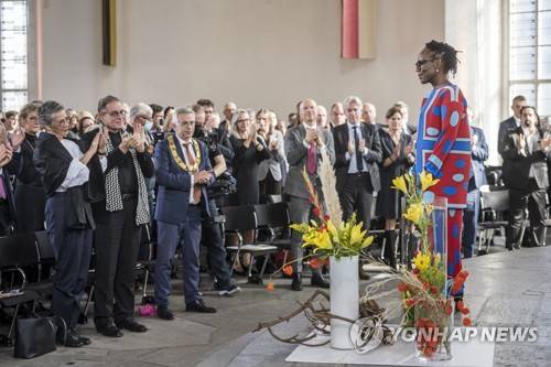 epa09542899 The 2021 Peace Prize laureate, Zimbabwean author and filmmaker Tsitsi Dangarembga (R) is applauded during the Peace Prize of the German Book Trade ceremony at the Paulskirche church in Frankfurt am Main, Germany, 24 October 2021. The Peace Prize of the German Book Trade by the German Publishers and Booksellers Association (Boersenverein des Deutschen Buchhandels) worth 25,000 EUR is presented since 1950 at the end of the Frankfurt Book Fair. EPA/Thomas Lohnes / Evangelischer Pressedienst / POOL
