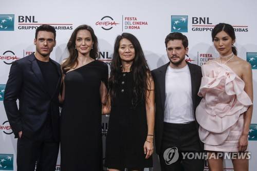 epa09542928 (L-R) Scottish actor Richard Madden, US actress Angelina Jolie, Chinese-born director Chloe Zhao, British actor Kit Harington, and English actress Gemma Chan pose during a photocall for the movie 'Eternals' at the 16th annual Rome International Film Festival, in Rome, Italy, 24 October 2021. The Festa Del Cinema Di Roma runs from 14 to 24 October. EPA/FABIO FRUSTACI