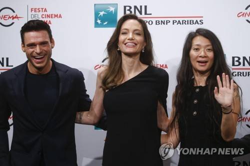 epa09542939 (L-R) Scottish actor Richard Madden, US actress Angelina Jolie, and Chinese-born director Chloe Zhao pose during a photocall for the movie 'Eternals' at the 16th annual Rome International Film Festival, in Rome, Italy, 24 October 2021. The Festa Del Cinema Di Roma runs from 14 to 24 October. EPA/FABIO FRUSTACI