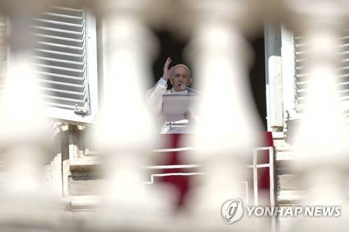 Pope Francis delivers his blessing as he recites the Angelus noon prayer from the window of his studio overlooking St.Peter's Square, at the Vatican, Sunday, Oct. 24, 2021. (AP Photo/Andrew Medichini)