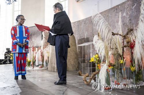 epa09542943 Zimbabwean author and filmmaker Tsitsi Dangarembga (L) receives the Peace Prize of the German Book Trade from Karin Schmidt-Friderichs (R), chairwoman of the German Publishers and Booksellers Association, during a ceremoy at the Paulskirche church in Frankfurt am Main, Germany, 24 October 2021. The Peace Prize of the German Book Trade by the German Publishers and Booksellers Association (Boersenverein des Deutschen Buchhandels) worth 25,000 EUR is presented since 1950 at the end of the Frankfurt Book Fair. EPA/Thomas Lohnes / Evangelischer Pressedienst / POOL