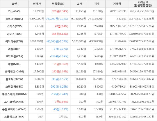 또한, 코박토큰(-5.59%, 5,485원), 휴먼스케이프(-3.74%, 309원), 온톨로지가스(-2.9%, 1,505원), 이더리움(-1.57%, 5,000,000원), 플로우(-0.55%, 16,280원), 리플(-0.37%, 1,330원)이 하락세를 나타냈다.