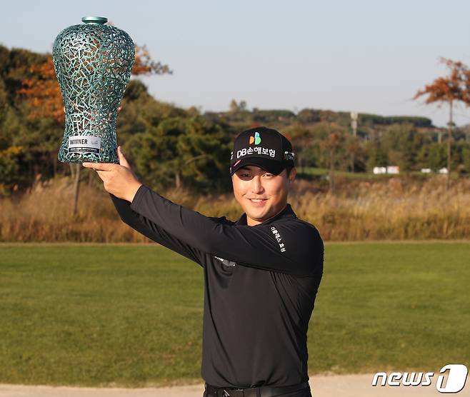 (인천=뉴스1) = 24일 인천 베어즈베스트 청라 GC에서 열린 하나은행 인비테이셔널에서 우승을 차지한 이태훈이 트로피를 들고 있다.(하나은행 인비테이셔널 대회본부 제공) 2021.10.24/뉴스1