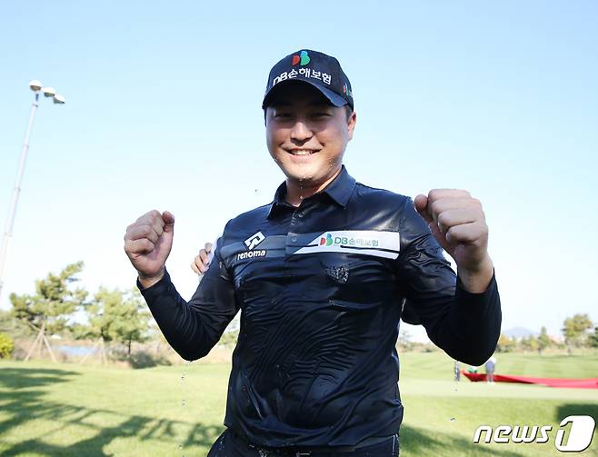 (인천=뉴스1) = 24일 인천 베어즈베스트 청라 GC에서 열린 하나은행 인비테이셔널에서 이태훈이 우승을 확정짓자 기뻐하고 있다.(하나은행 인비테이셔널 대회본부 제공) 2021.10.24/뉴스1