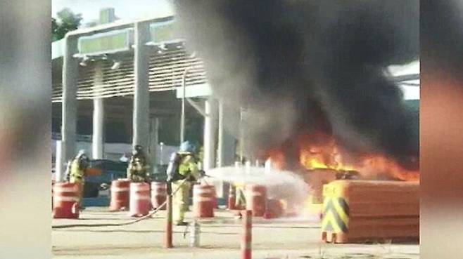 고속도로 요금소 앞에 차량이 불길에 휩싸였습니다.