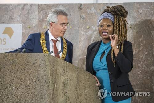 epa09542958 City Councilor Mirrianne Mahn (R, Die Gruenen/The Greens) interrupts Frankfurt Mayor Peter Feldmann's speech on racism and right-wing tendencies and speaks of her fears about racism during the Peace Prize of the German Book Trade ceremony at the Paulskirche church in Frankfurt am Main, Germany, 24 October 2021. The Peace Prize of the German Book Trade by the German Publishers and Booksellers Association (Boersenverein des Deutschen Buchhandels) worth 25,000 EUR is presented since 1950 at the end of the Frankfurt Book Fair. EPA/Thomas Lohnes / Evangelischer Pressedienst / POOL