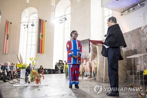 epa09542968 Zimbabwean author and filmmaker Tsitsi Dangarembga (L) receives the Peace Prize of the German Book Trade from Karin Schmidt-Friderichs (R), chairwoman of the German Publishers and Booksellers Association, during a ceremoy at the Paulskirche church in Frankfurt am Main, Germany, 24 October 2021. The Peace Prize of the German Book Trade by the German Publishers and Booksellers Association (Boersenverein des Deutschen Buchhandels) worth 25,000 EUR is presented since 1950 at the end of the Frankfurt Book Fair. EPA/Thomas Lohnes / Evangelischer Pressedienst / POOL
