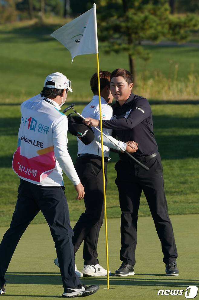 (인천=뉴스1) = 24일 인천 베어즈베스트 청라 GC에서 열린 하나은행 인비테이셔널에서 우승을 차지한 이태훈이 동료들의 축하를 받고 있다.(하나은행 인비테이셔널 대회본부 제공) 2021.10.24/뉴스1