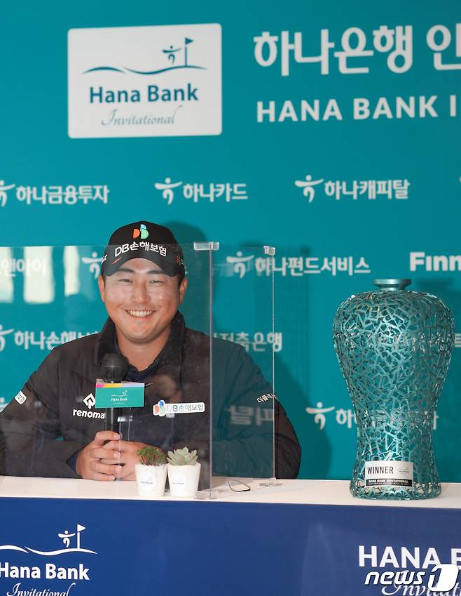 (인천=뉴스1) = 24일 인천 베어즈베스트 청라 GC에서 열린 하나은행 인비테이셔널에서 우승을 차지한 이태훈이 인터뷰하고 있다.(하나은행 인비테이셔널 대회본부 제공) 2021.10.24/뉴스1