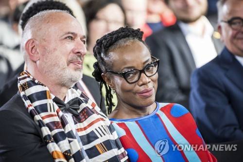 epa09542970 The 2021 Peace Prize laureate, Zimbabwean author and filmmaker Tsitsi Dangarembga (R) and her husband Olaf Koschke attend the ceremony of the Peace Prize of the German Book Trade at the Paulskirche church in Frankfurt am Main, Germany, 24 October 2021. The Peace Prize of the German Book Trade by the German Publishers and Booksellers Association (Boersenverein des Deutschen Buchhandels) worth 25,000 EUR is presented since 1950 at the end of the Frankfurt Book Fair. EPA/Thomas Lohnes / Evangelischer Pressedienst / POOL