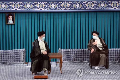 epa09542983 A handout photo made available by the Iranian supreme leader office shows, Ayatollah Ali Khamenei (L) speaking with Iranian president Ebrahim Raisi (R) during a meeting with members of the participants in an Islamic unity conference, in Tehran, Iran, 24 October 2021. According to the leader official website, Khamenei said that Palestine is the main topic for Islamic countries and those Islamic countries who have normalised their relations with Israel should return from that and help Palestine. EPA/HANDOUT HANDOUT EDITORIAL USE ONLY/NO SALES