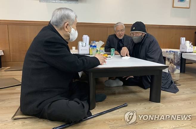 (서울=연합뉴스) 한미희 기자 = 24일 서울 서대문구 신촌세브란스 장례식장에 마련된 이태원 태흥영화사 대표의 빈소를 찾은 임권택(왼쪽부터), 임상수, 정일성 감독이 대화하고 있다.