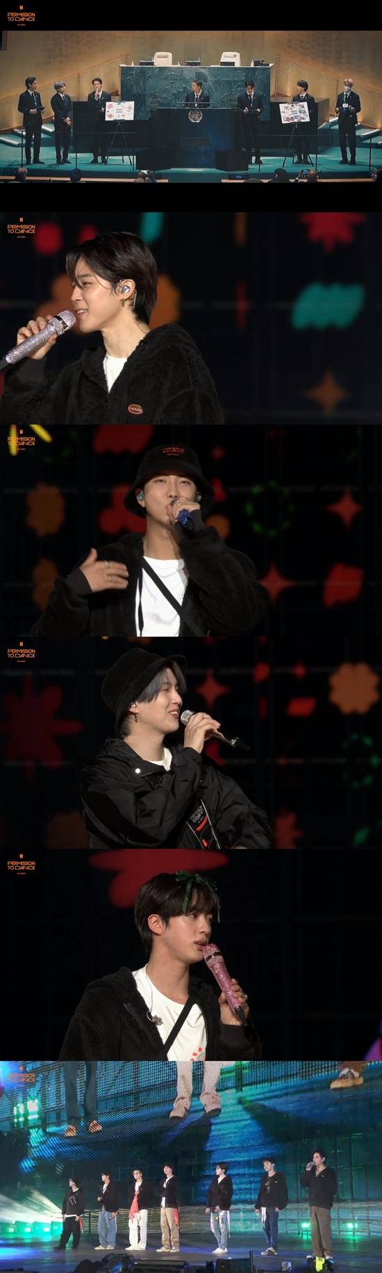 앙코르 전 VCR에서는 제76차 유엔총회에 참석했을 당시 방탄소년단이 전한 긍정의 메시지가 담겨 눈길을 끌었다. 이어 다시 무대에 오른 방탄소년단은 'EPILOGUE : Young Forever', '봄날'을 열창했다. 마지막곡으로는 'Permission to Dance'를 선곡, 긍정 기운을 불어 넣으며 공연을 마쳤다.