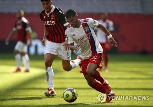 epa09543000 Houssem Aouar (R) of Olympique Lyon in action during the French Ligue 1 soccer match between OGC Nice and Olympique Lyon at the Allianz Riviera stadium in Nice, France, 24 October 2021. EPA/SEBASTIEN NOGIER