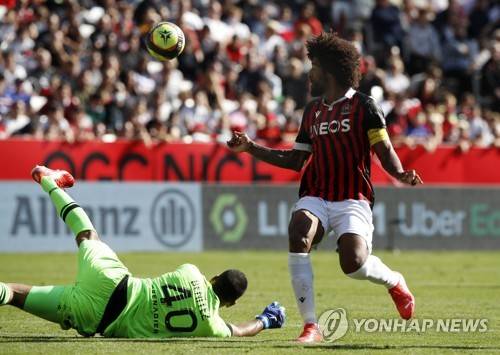 epa09543001 Dante (R) of OGC Nice in action in action during the French Ligue 1 soccer match between OGC Nice and Olympique Lyon at the Allianz Riviera stadium in Nice, France, 24 October 2021. EPA/SEBASTIEN NOGIER