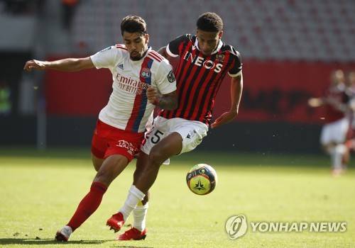 epa09543018 Jean-Clair Todibo (R) of Nice and Lucas Paqueta (L) of Lyon in action during the French Ligue 1 soccer match between OGC Nice and Olympique Lyon in Nice, France, 24 October 2021. EPA/SEBASTIEN NOGIER