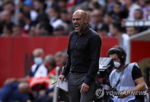 epa09543019 Olympique Lyon's Dutch head coach Peter Bosz reacts during the French Ligue 1 soccer match between OGC Nice and Olympique Lyon at the Allianz Riviera stadium in Nice, France, 24 October 2021. EPA/SEBASTIEN NOGIER