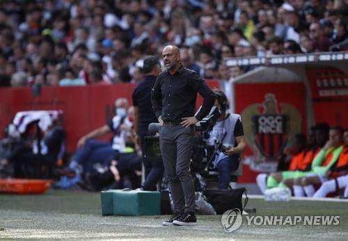 epa09543033 Olympique Lyon's head coach Peter Bosz reacts during the French Ligue 1 soccer match between OGC Nice and Olympique Lyon in Nice, France, 24 October 2021. EPA/SEBASTIEN NOGIER