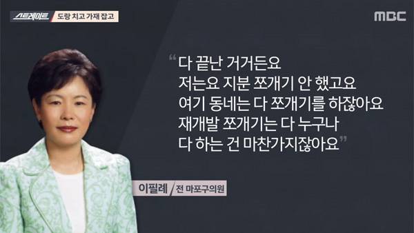 방송 시작 부분에 나온 지난해 마포공덕시장 재개발조합 총회의 영상을 보면 조합장 후보 중 한 명이 자신만이 용적률을 올릴 수 있는 후보라고 외쳤다.
