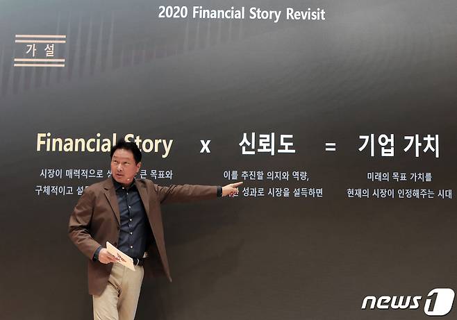(이천=뉴스1) = 최태원 SK그룹 회장이 지난 22일 경기 이천시 SKMS연구소에서 열린 '2021 CEO세미나'에서 폐막 스피치를 하고 있다.(SK 제공) 2021.10.24/뉴스1