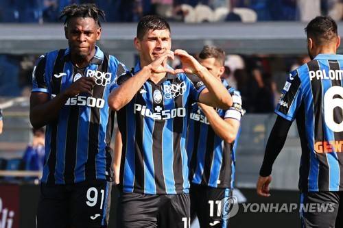 epa09543035 Atalanta's Ruslan Malinovskyi (C) celebrates after scoring the 1-0 goal during the Italian Serie A soccer match between Atalanta BC and Udinese Calcio at the Gewiss Stadium in Bergamo, Italy, 24 October 2021. EPA/PAOLO MAGNI