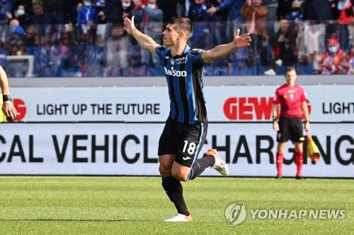 epa09543037 Atalanta's Ruslan Malinovskyi celebrates after scoring the 1-0 goal during the Italian Serie A soccer match between Atalanta BC and Udinese Calcio at the Gewiss Stadium in Bergamo, Italy, 24 October 2021. EPA/PAOLO MAGNI