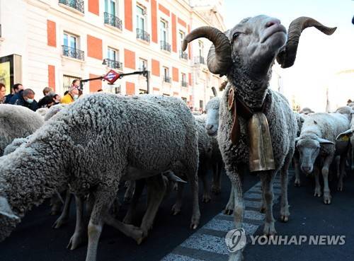 epa09543045 One thousand Merino sheep and one hundred Retinta goats from the flock of the Mesta Council are walking the streets of downtown Madrid, central Spain, 24 October 2021, during the Feast of Transhumance, a tradition where cattle breeders use ancient livestock trails. EPA/FERNANDO VILLAR