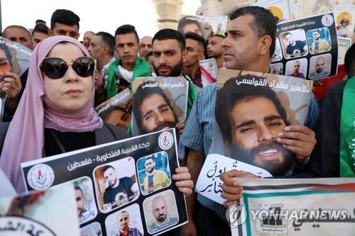 epa09543052 Palestinian students chant slogans during a rally calling for the release of their relatives from Israeli jails in the West Bank city of Hebron, 24 October 2021. According to rights groups, there are 4,650 Palestinian prisoners in Israeli jails, including 520 being under administrative detention without standing on trials. EPA/ABED AL HASHLAMOUN