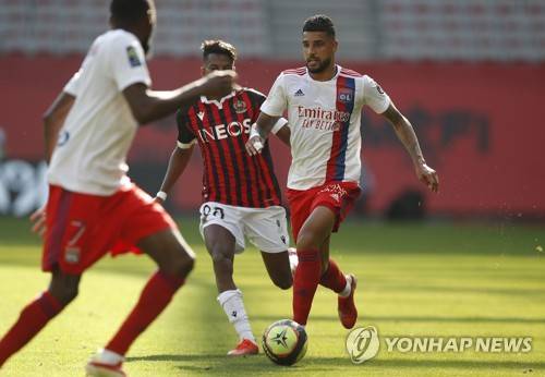 epa09543073 Emerson Palmieri (R) of Olympique Lyon in action during the French Ligue 1 soccer match between OGC Nice and Olympique Lyon in Nice, France, 24 October 2021. EPA/SEBASTIEN NOGIER