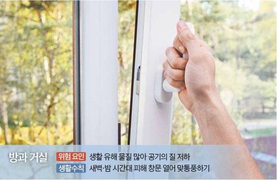 하루에 최소 한 번은 청소하는 게 좋다. 청소기를 돌린 다음 밀대를 이용해 물걸레질하면 진공청소기만 사용했을 때보다 미세먼지 같은 유해 물질 제거 효과가 크다. 물걸레 청소는 바닥에 가라앉은 먼지를 다시 날리게 할 가능성이 작기 때문이다. 환기·청소와 별도로 공기청정기를 사용하는 것도 방법이다. 예를 들어 대기 질이 나쁠 때 환기를 하면 실내 미세먼지 농도가 순간적으로 높아질 수 있다. 최대 풍량으로 일정 시간 가동한 다음 중 또는 약 모드를 유지하면 효과적이다. 가정용 공기청정기는 대부분 필터식이다. 필터를 교체하지 않으면 포집된 먼지가 필터를 막아 풍량이 급격히 줄어든다. 공기 순환율이 낮아져 공기 정화 능력이 감소하므로 권장 필터 교체 주기를 지킨다.