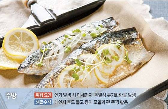 특히 기름을 이용해 육류나 생선을 조리할 땐 자연 환기를 하고 주방 레인지 후드를 켠다. 요리가 끝난 후에도 최소 30분 이상 켜두는 게 좋다. 구이 요리를 할 땐 프라이팬에 종이 포일을 깔거나 뚜껑을 덮고, 튀김 요리를 할 땐 재료가 기름에 완전히 잠기도록 한다. 밀폐된 공간에서 레인지 후드를 틀면 압력 손실이 발생해 가동 효과가 떨어지므로 창문을 조금 열어 두고 기름때나 미생물이 번식하지 않도록 자주 세척한다. 요리로 인해 유해 물질이 발생한 상황에서 곧바로 공기청정기를 틀면 기름 입자 등이 필터를 막아 필터 수명이 줄고 냄새가 밸 수 있다. 요리하는 동안엔 꺼두고 요리가 끝난 다음 충분히 환기한 후 공기청정기를 사용하는 것이 추천된다. 조리 도구와 재료를 치우지 않고 놔두면 오염 물질이 계속 방출되므로 가급적 빨리 정리하고 바닥에 가라앉은 오염원이 날리지 않도록 물걸레질한다.