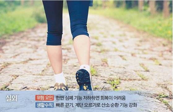 다만 천천히 걸으면 1만 보를 걷더라도 소용없다. 숨차고 땀이 날 정도의 빠른 속도로 약 7000보 걷는 것이 더 효과적이며 하루 30분가량 주 3회 이상 규칙성을 갖는 것이 좋다. 걷기 운동이 여의치 않다면 계단 오르기가 대안이다. 일상생활에서 엘리베이터를 타는 대신 계단을 오르는 습관을 들이면 혈액순환과 산소 순환 기능을 원활히 하는 데 도움된다. 평지를 걸을 때보다 더 많은 에너지가 소모돼 심폐 기능을 좀 더 강화하는 데 효과가 있다.
