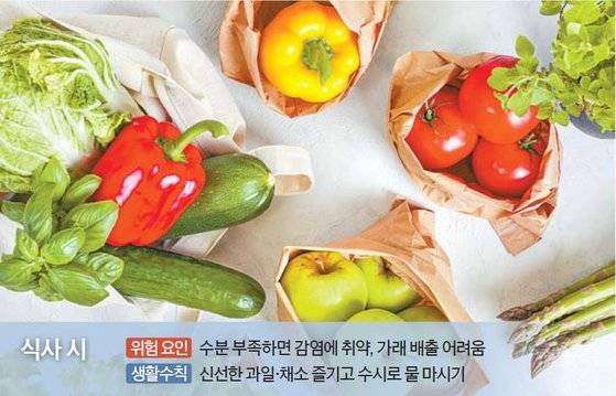 물을 수시로 마시는 것도 폐 건강을 지키는 지름길이다. 수분을 충분히 섭취하지 못해 탈수 상태가 되면 기도 점막이 건조해지고 점막 속에 있는 섬모가 운동 능력을 충분히 발휘하지 못한다. 그러면 감염에 취약해지고 가래 배출이 잘 안 돼 폐 질환 발병 위험에 노출될 수 있다.