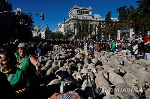 epa09543094 One thousand Merino sheep and one hundred Retinta goats from the flock of the Mesta Council are walking the streets of downtown Madrid, central Spain, 24 October 2021, during the Feast of Transhumance, a tradition during which cattle breeders use ancient livestock trails. EPA/FERNANDO VILLAR